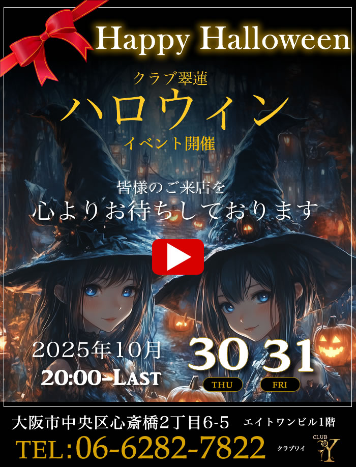 イベント 翠蓮では様々なイベントをご用意しております。皆様のご来店を心よりお待ち申し上げます。 ハロウィンイベント開催! 今年もクラブ翠連のハロウィンイベントを開催いたします。お忙しいかと存じますが皆様のご来店を心よりお待ちしております。 2025年10月30日(木)・10月31日(金)20:00~LAST ※下の画像をクリックすると動画がご覧いただけます お試し価格は初めてのご来店の際にお申し付けくださいませ