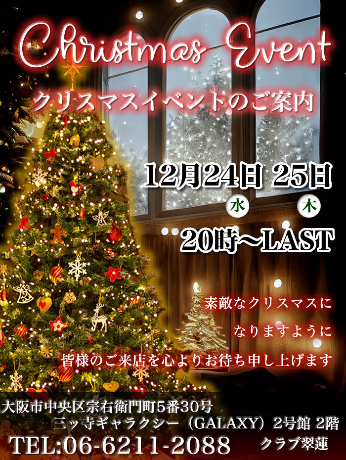 イベント 翠蓮では様々なイベントをご用意しております。皆様のご来店を心よりお待ち申し上げます。 クリスマスイベント開催! 今年もクラブ翠連のクリスマスイベントを開催いたします。お忙しいかと存じますが皆様のご来店を心よりお待ちしております。 2025年12月24日(水)・25日(木)20:00~LAST ※下の画像をクリックすると動画がご覧いただけます お試し価格は初めてのご来店の際にお申し付けくださいませ